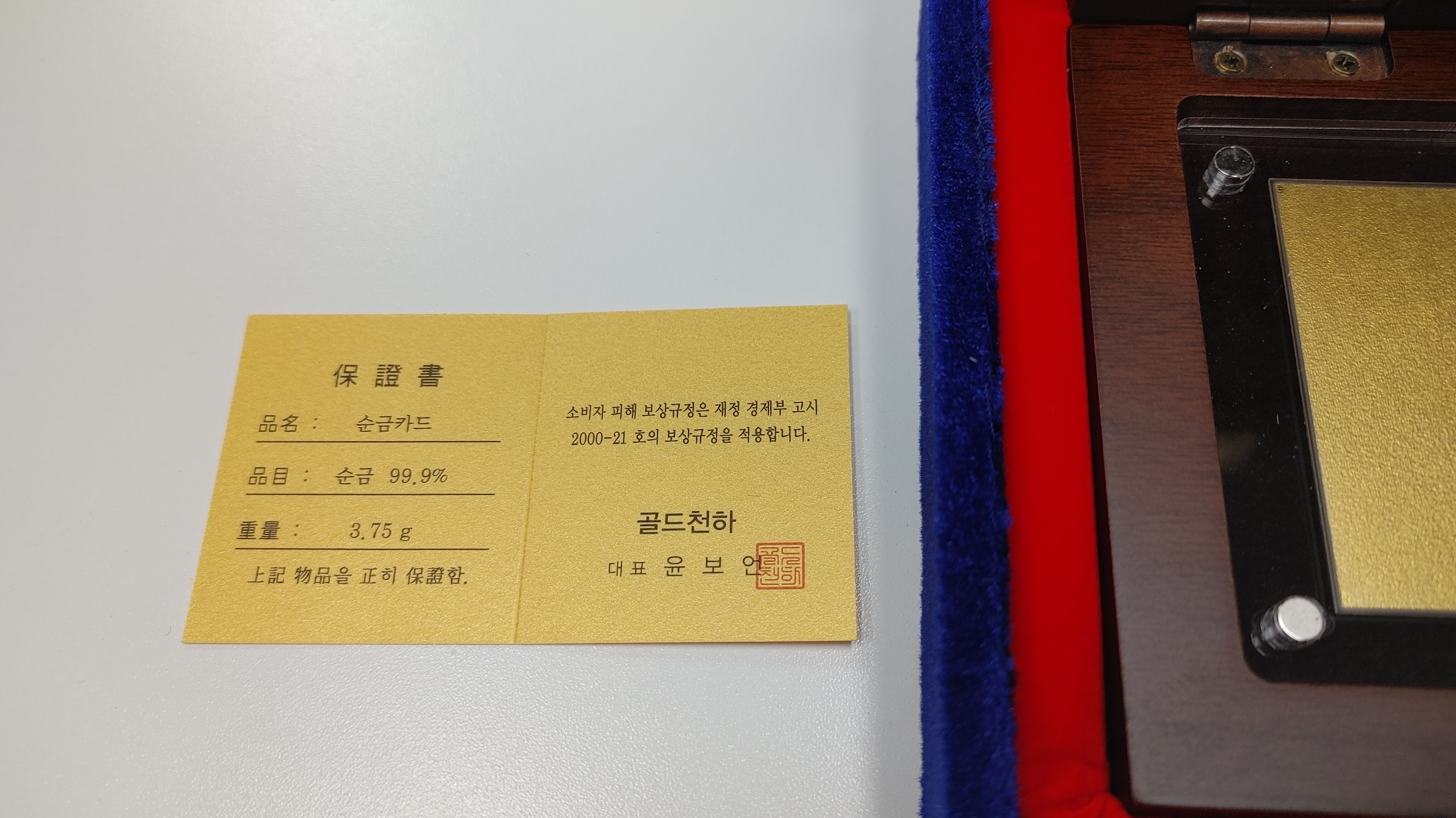 순금 99.9%의 보증서가 동봉되어있습니다. 3.75g 한돈이네요.