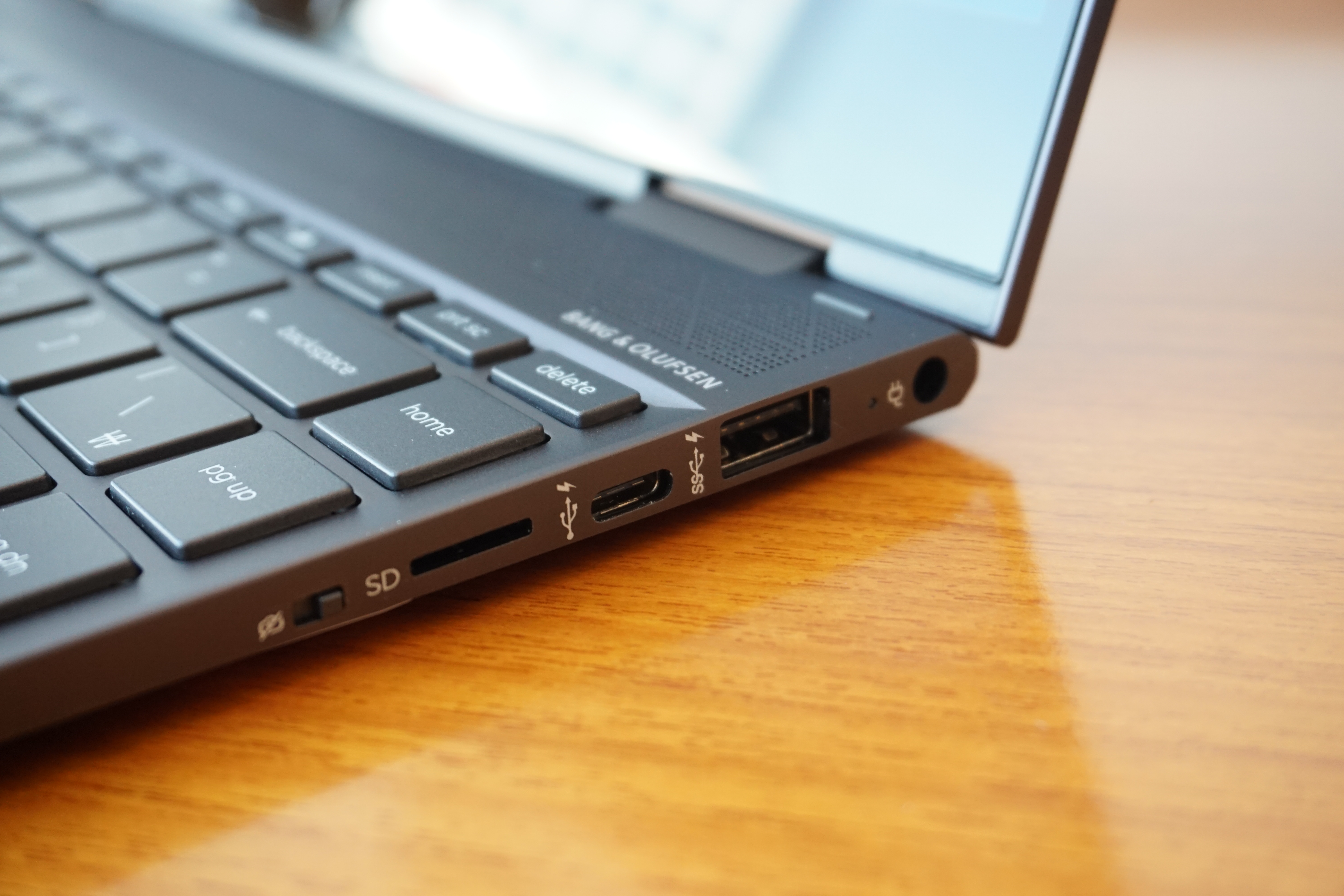 우측 측면 모습입니다. 프라이버시 카메라 킬 스위치와 microSD메모리 슬롯,USB C타입 3.1RHK USB 3.1포트와 전원 커넥터로 이루어져있습니다. 프라이버시 카메라 킬 스위치는 후에 별도로 다시 설명 드리겠습니.