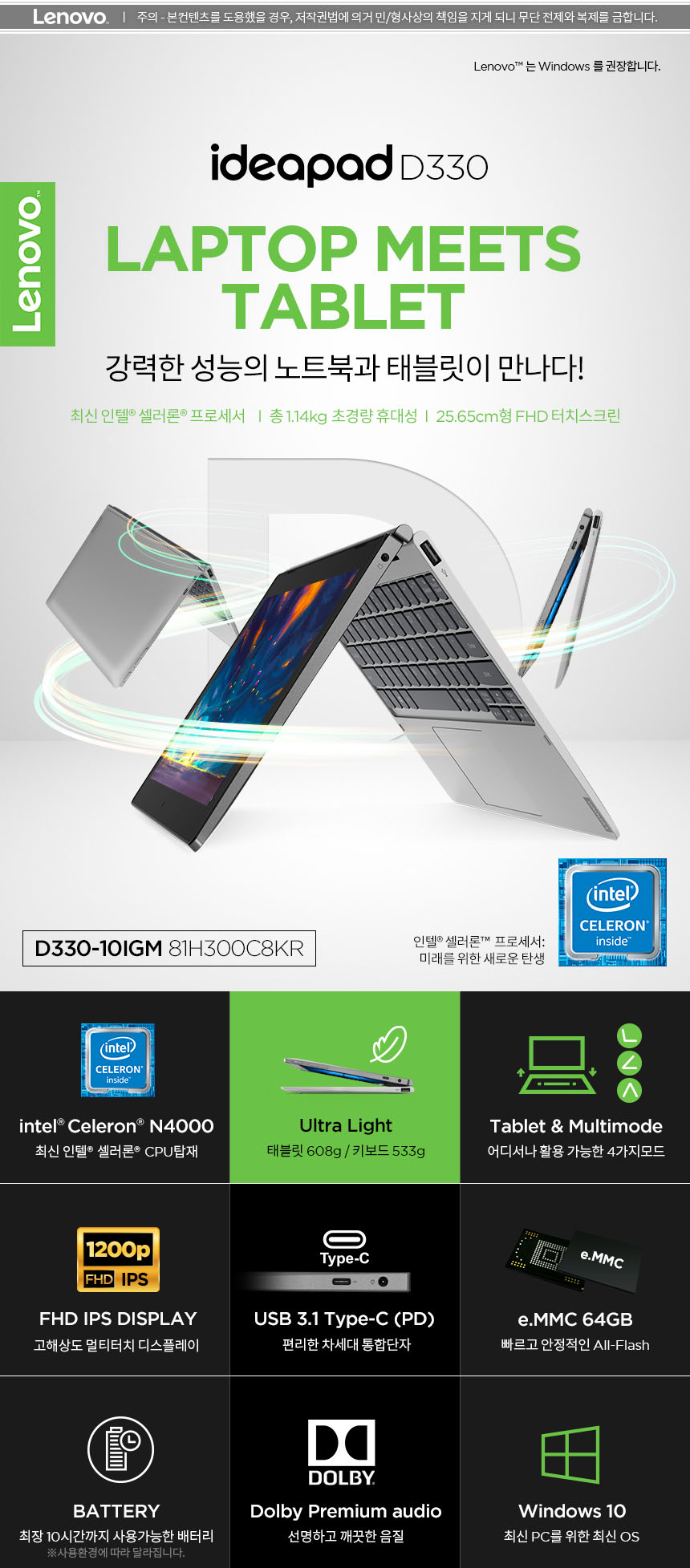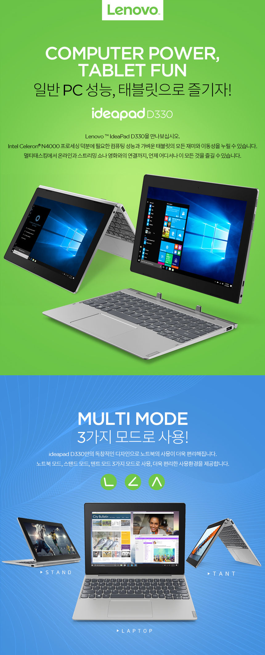 30만원대의 보급형 문서작성 기기로는 그래도 손색이 없는 레노버 D330은 가볍게 장만할수 있는 기기로는 좋은 선택일듯 합니다.