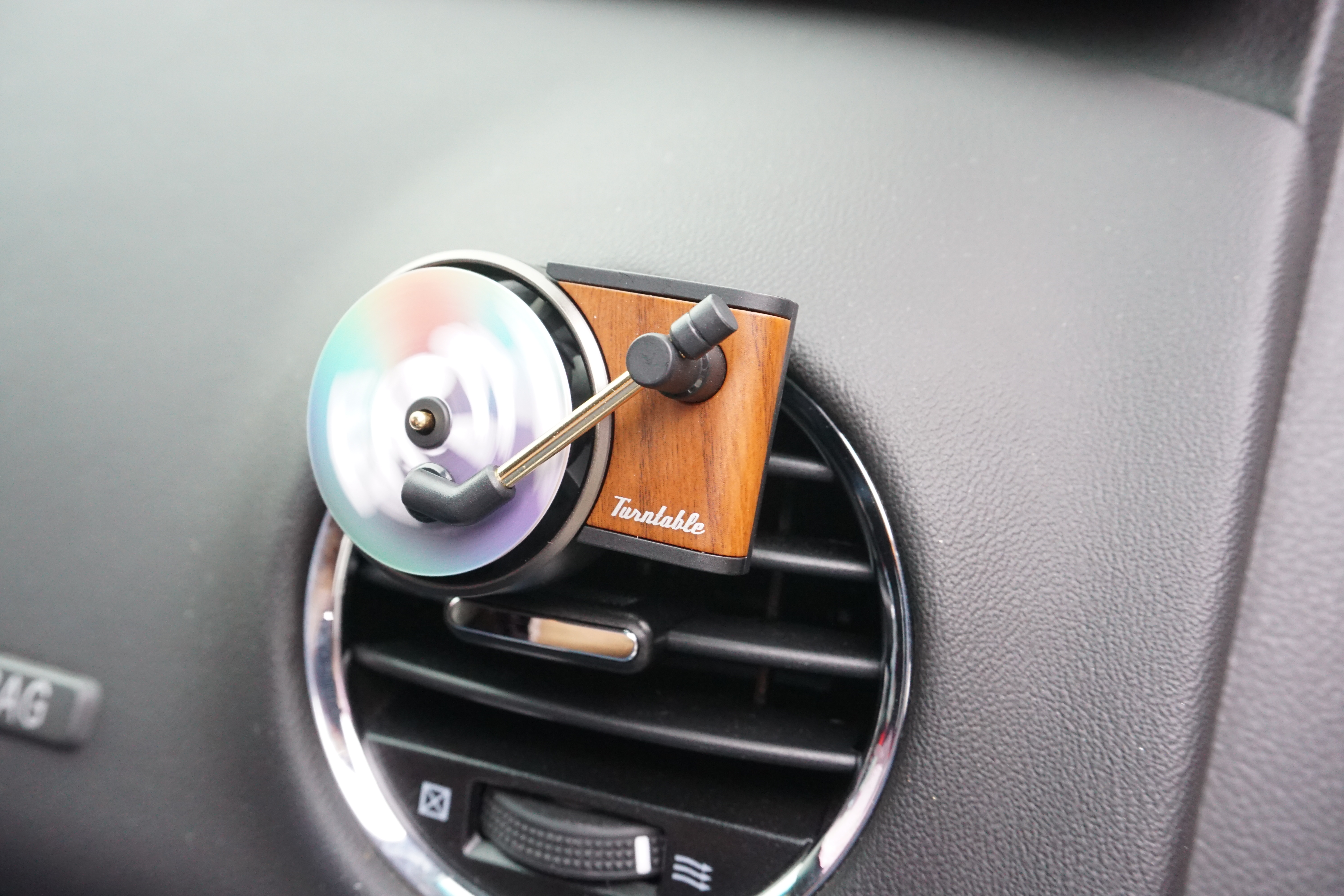 차에 장착을 하고 에어컨 (혹은 히터)를 동작하면 이렇게 LP판이 빙글빙글 돌아갑니다