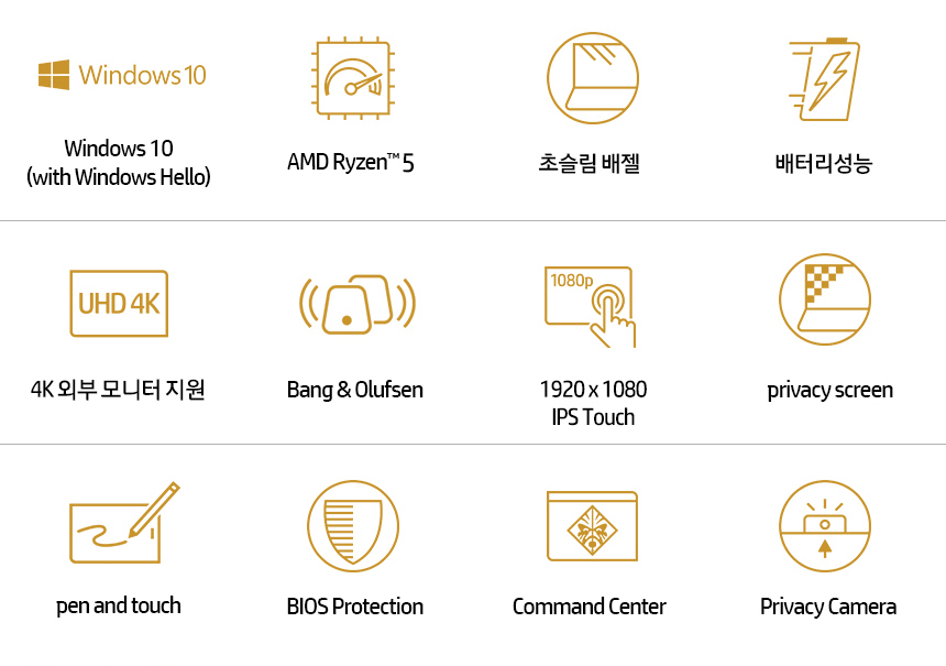 윈도10이 포함되어있고 AMD의 라이젠5 CPU가 탑재되어있으며 풀HD해상도의 IPS 터치화면을 지원하면서