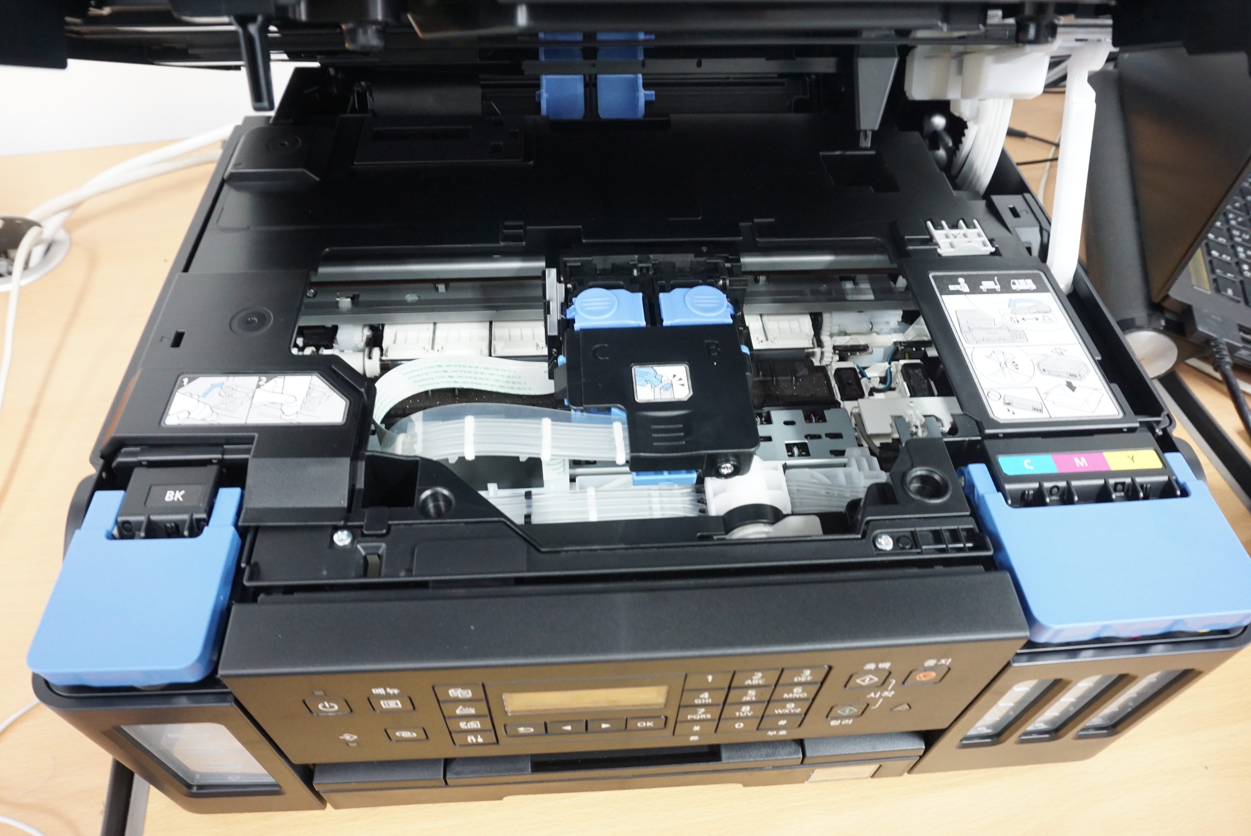 사무실에서 2년 정도 사용하던 개조된 팩스겸 복합기가 자꾸 말썽을 일으켜서 정품 무한 잉크젯 복합기로 새롭게 장만했습니다.