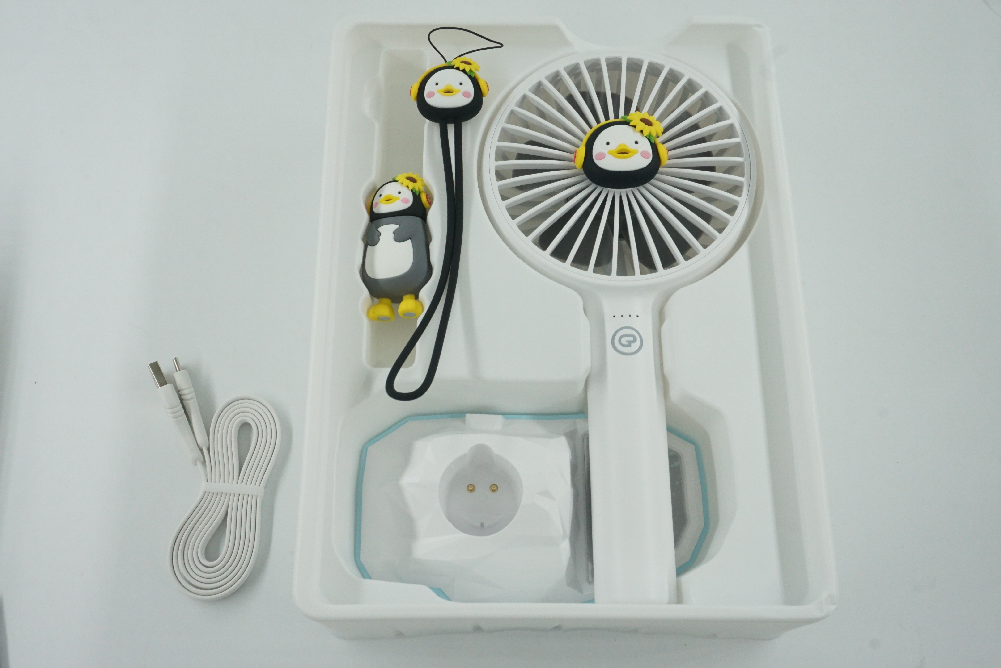 구성품입니다. 펭수 피규어와 손풍기 본체, 스트랩과 크래들 그리고 케이블로 구성되어있습니다.