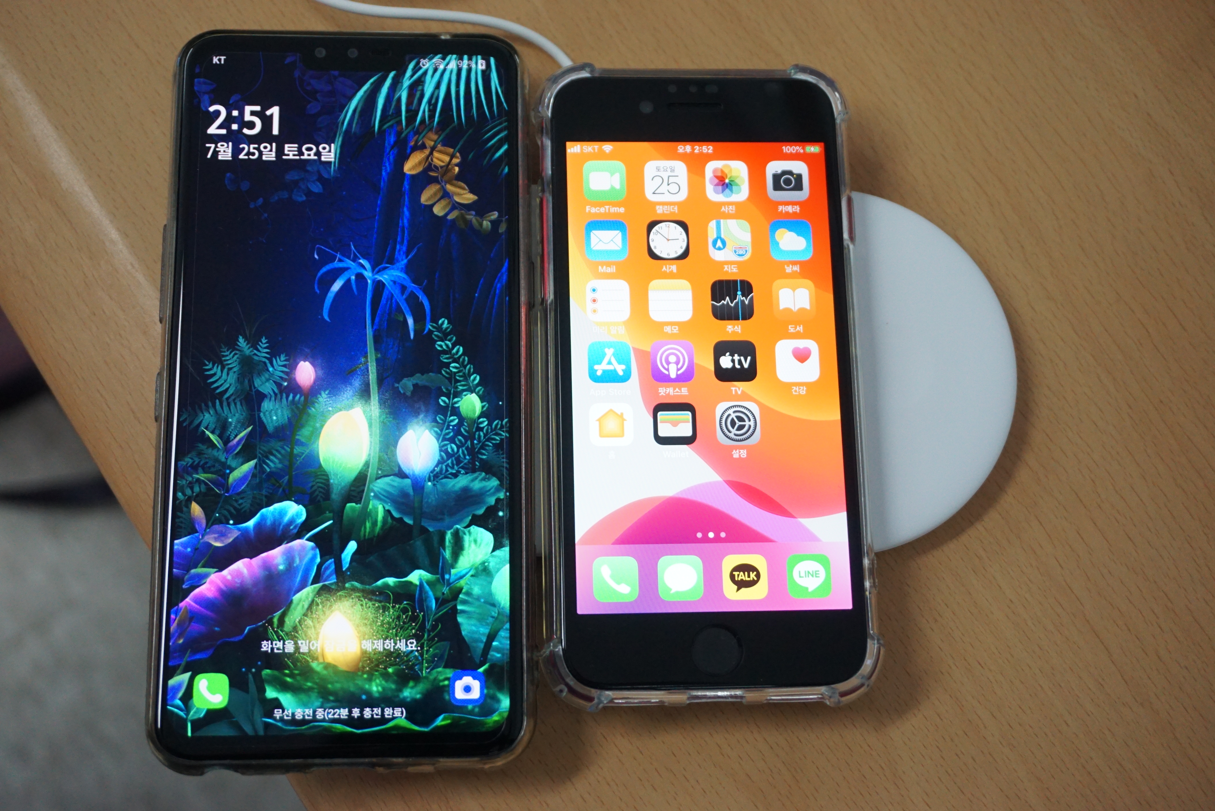 LG V50과 아이폰SE2를 나란히 올려봤습니다. 둘다 충전이 잘 됩니다.