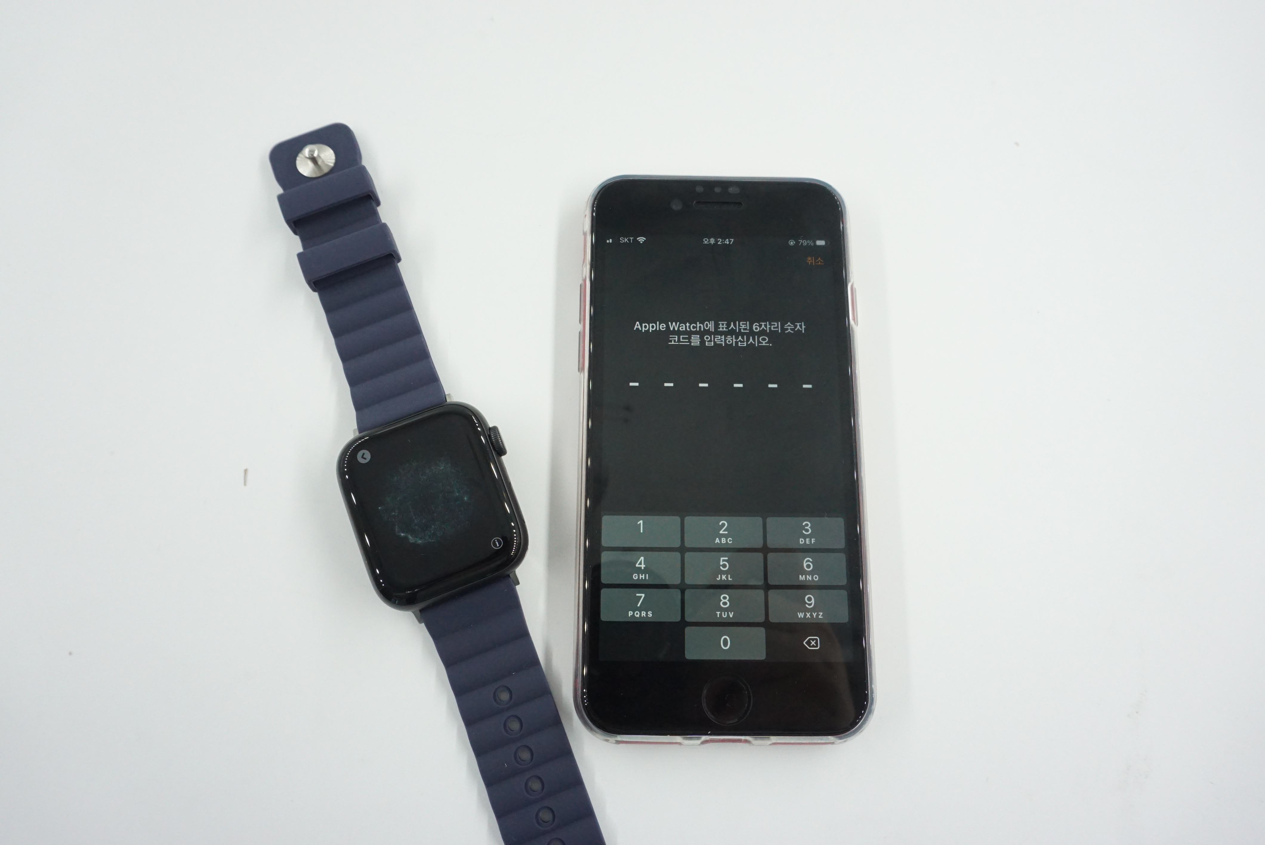 연결은 간단합니다. 아이폰의 시계 앱을 설정하고 저렇게 코드가 나오면 애플워치에 6개의 숫자만 일치 시켜주면 끝납니다.