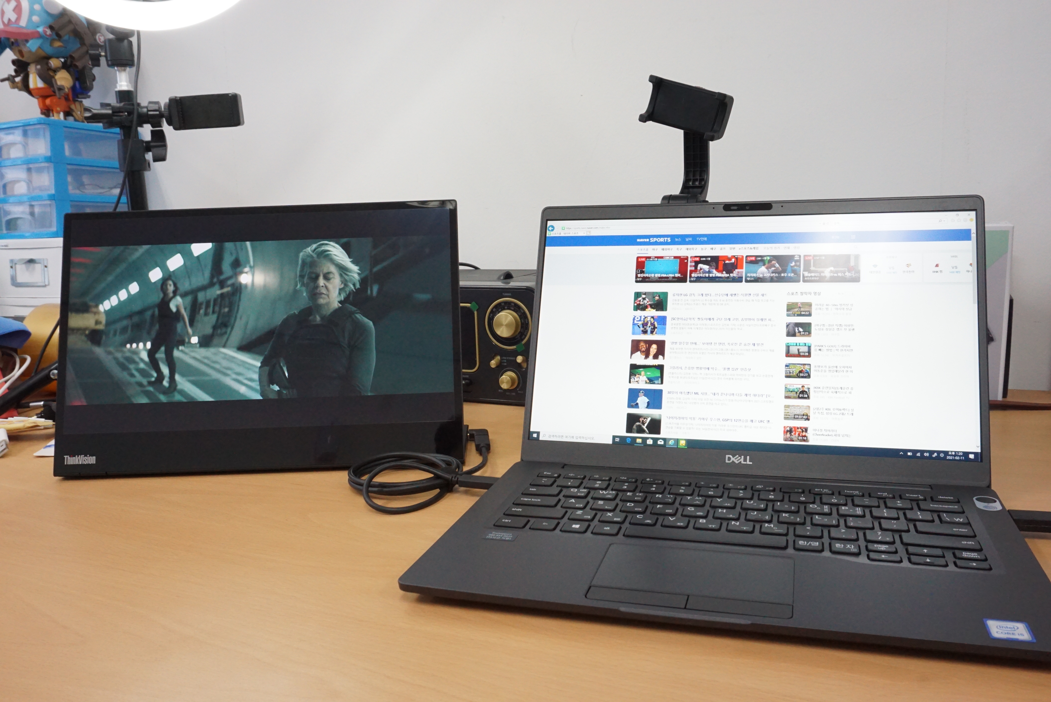 노트북에 물려봅니다. 화면 복제와 확장 둘다 지원합니다.