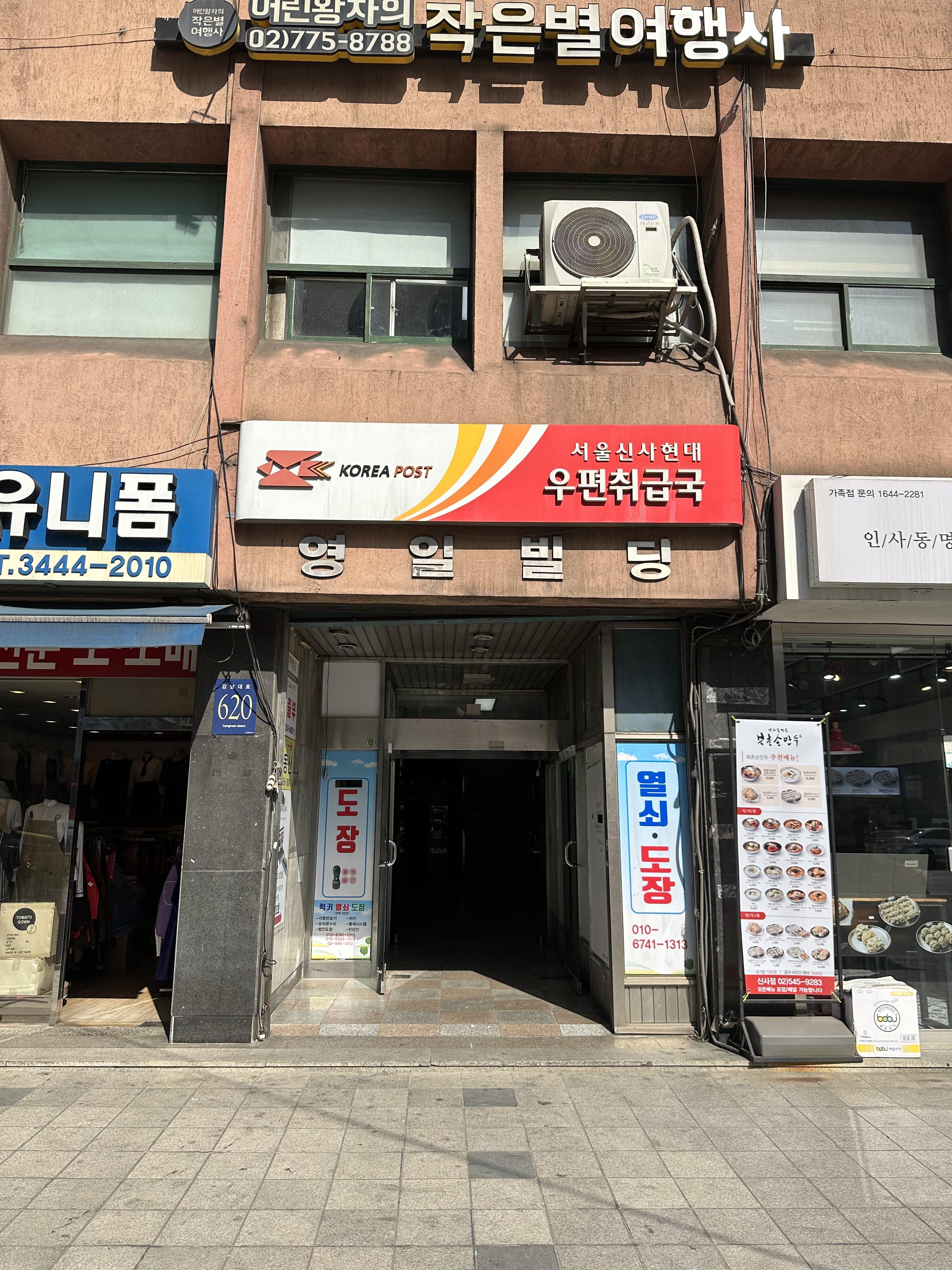 바로 오른쪽에 이렇게 우체국간판이 크게 보이는 영일빌딩 이 빌딩 202호가 힐링쉴드 신사점입니다.