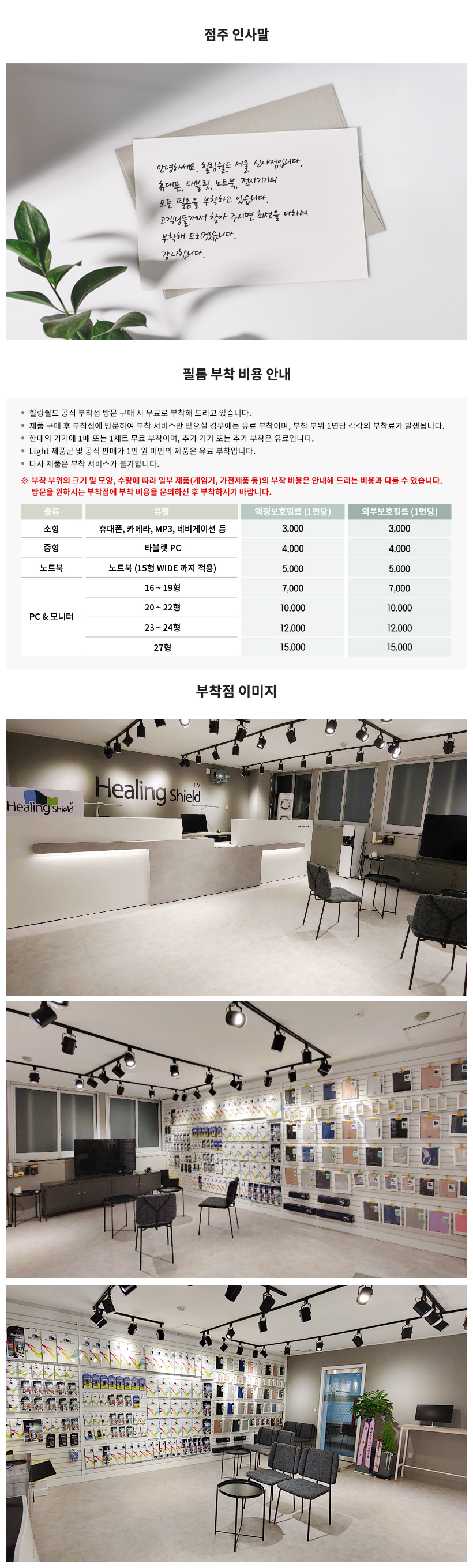힐링쉴드 전문 판매/부착점답게 힐링쉴드를 전문적으로 부착하고 계셨고 힐링쉴드 제품을 구매시에는 부착을 무료로 해주십니다. 필름을 별도로 들고오신 고객님들께는 소정의 부착비가 발생하니 참고하세요.